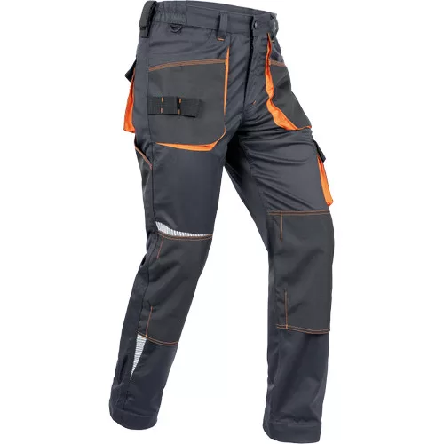 • férfi munkanadrág, rendkívül tartós rugalmas anyagból • elasztikus derékkal • multifunkcionális zsebek • Oxford 600D megerősített térdzsebek térdvédők behelyezéséhez • nyomtatott szegmensekre bontott fényvisszavető részletek • állítható szárhossz