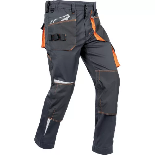 • férfi munkanadrág, rendkívül tartós rugalmas anyagból • elasztikus derékkal • multifunkcionális zsebek • Oxford 600D megerősített térdzsebek térdvédők behelyezéséhez • nyomtatott szegmensekre bontott fényvisszavető részletek • állítható szárhossz
