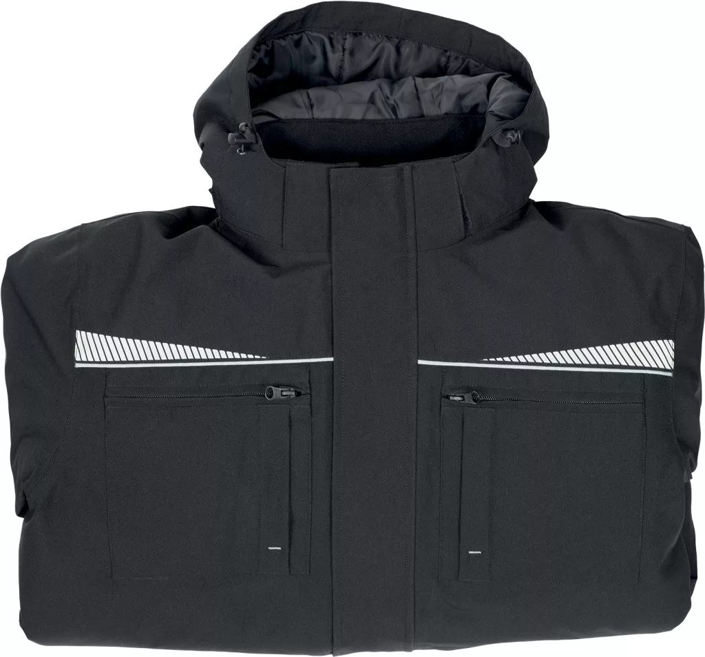 Vízálló téli kabát levehető, bélelt kapucnival. A kabát cipzárral záródik, amelyet kívülről tépőzárral rögzíthető fedés borít. Két cipzáras oldalzsebbel, két mellzsebbel és két belső zsebbel rendelkezik, ujjain rugalmas mandzsettával. Fényvisszaverő részletei és retroreflektív elemei fokozzák a láthatóságot. A termék megfelel az EN ISO 13688 szabványnak.