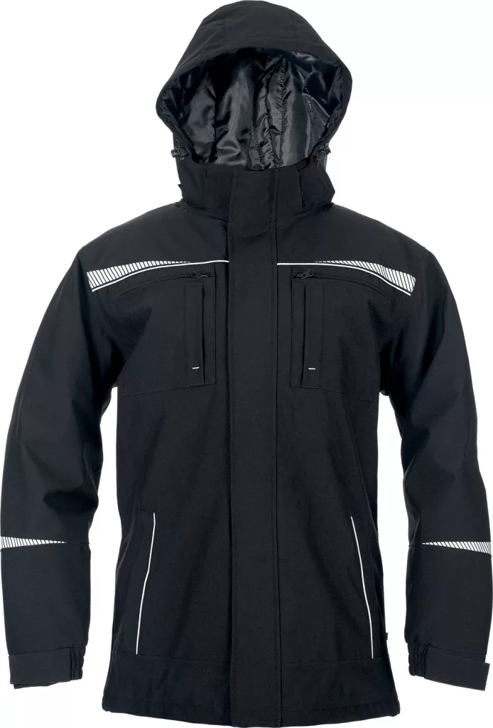 Vízálló téli kabát levehető, bélelt kapucnival. A kabát cipzárral záródik, amelyet kívülről tépőzárral rögzíthető fedés borít. Két cipzáras oldalzsebbel, két mellzsebbel és két belső zsebbel rendelkezik, ujjain rugalmas mandzsettával. Fényvisszaverő részletei és retroreflektív elemei fokozzák a láthatóságot. A termék megfelel az EN ISO 13688 szabványnak.