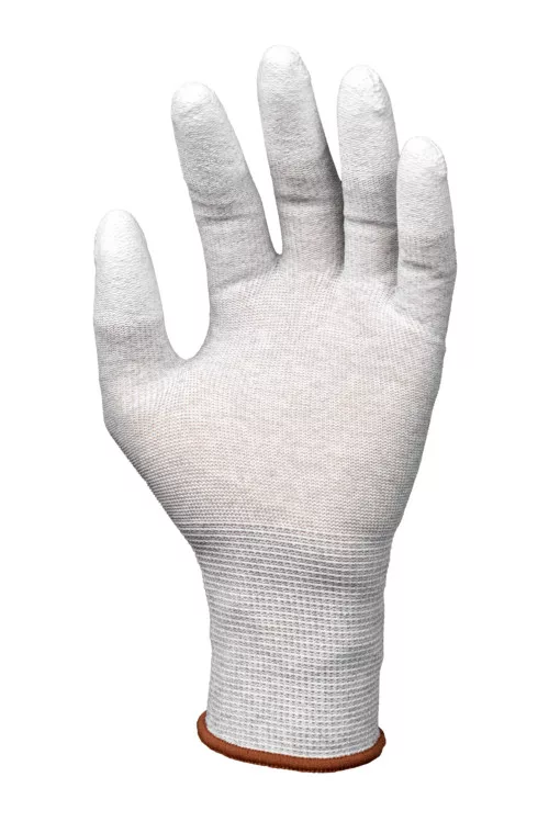 Szénszálas, rugalmas, kötött poliészter precíziós védőkesztyű, fehér PU-val mártott ujjakkal és kötött mandzsettávalKiváló fogásbiztosságának köszönhetően tökéletesen alkalmas apró mikro-elektronikai alkatrészek kezeléséhez Megakadályozza az elektrosztatikus kisülést és tűz- és robbanásveszélyes környezetben is használható