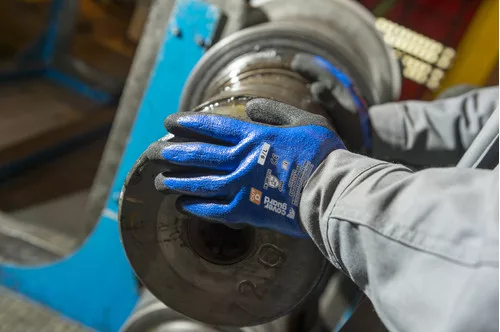 Pettyezett, szürke,13-mas kötésű varrásnélküli kesztyű. HPPE-vel, ásványi szálakkal, poliamiddal és elasztánnal erősítve.Duplán mártott nitril tenyér: egy réteg sima kék, egy érdesített fekete.Ergonómikus kialakítás.Kötött mandzsetta