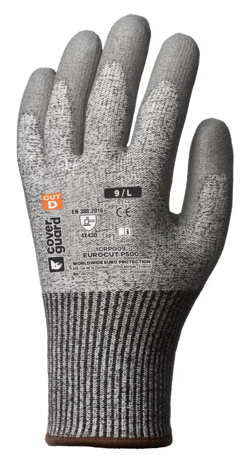 Pettyezett szürke kesztyű HDPE-ből, ásványi szálakból, poliamid és elasztánból 13-mas kötésűSzürke poliuretánnal mártott tenyérFonott mandzsetta