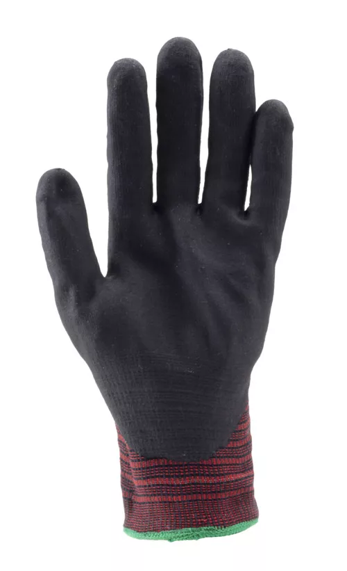 Fekete HDPE-vel, kevlárral és spandex-el erősített 18-as fonású kesztyű. Fekete nitril mikro habbal erősített tenyér. Erősített a hüvelyk és mutató ujjnál.Fertőtlenített: Megakadályozza a baktériumok és a kellemetlen szagok kialakulását.Kötött mandzsetta
