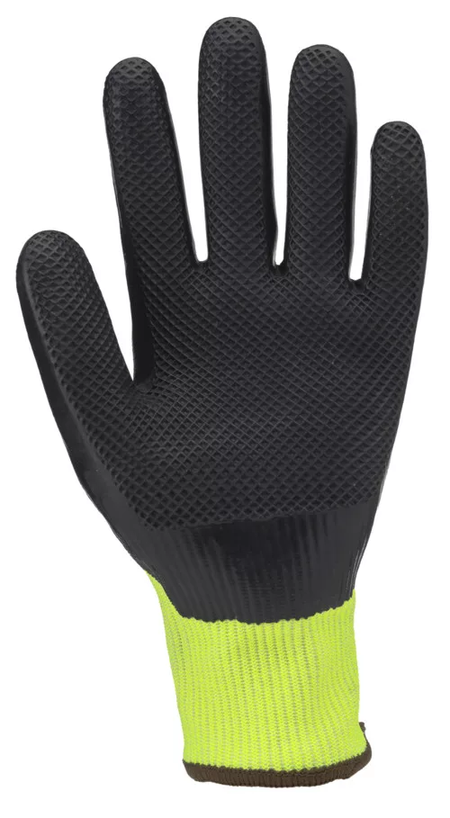 •13-as kötésű fluo sárga HDPE, poliészter, elasztán alapanyagú védőkesztyű•tenyerén fekete sima latex bevonat gyémántmintás felülettel