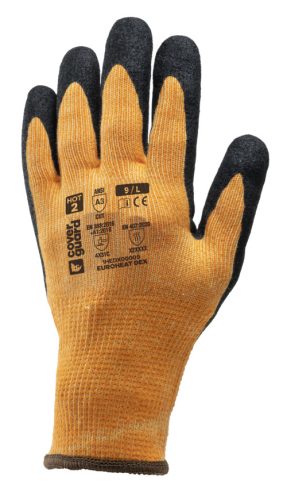 EUROHEAT DEX kesztyű, narancssárga varrat nélküli kötött, 10-es, poliészter és aramid alap, hurkolt belső, homokos felületű nitril tenyérbevonat, kötött csukló.
