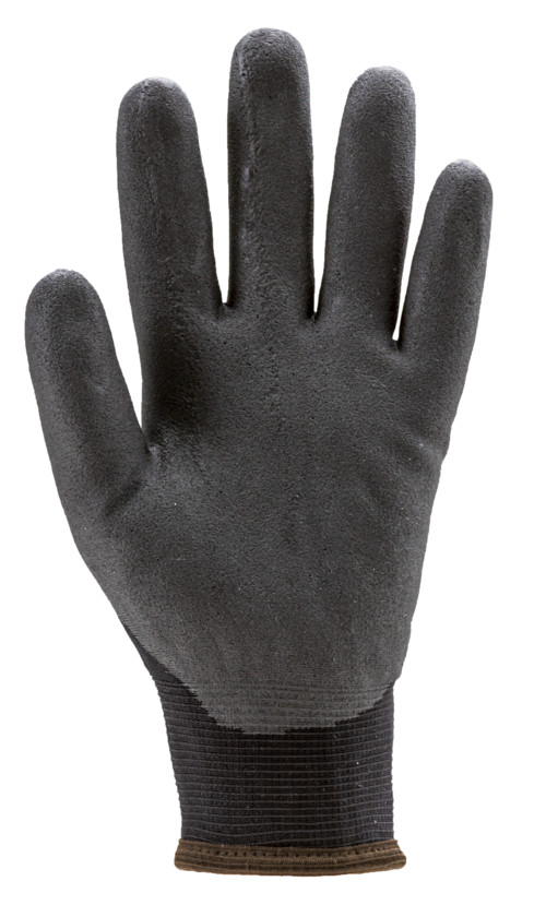 Fekete, varrás nélküli, poliamiddal erősített, 15-ös kötésű kesztyűFekete akril bélésselFekete PVC-HTP habbal az ökölcsontigKötött mandzsettávalMinősítéssel OEKO-TEX® STANDARD 100, CQ 1301/1, IFTH
