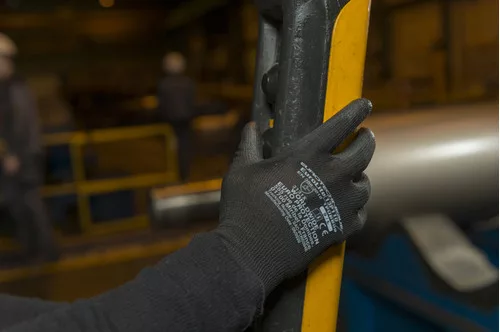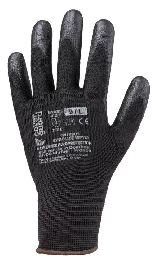 Fekete, varrás nélküli, poliészterrel erősített, 13-mas kötésű kesztyű, fekete poliuretánnal mártott tenyérrel és kötött mandzsettával.