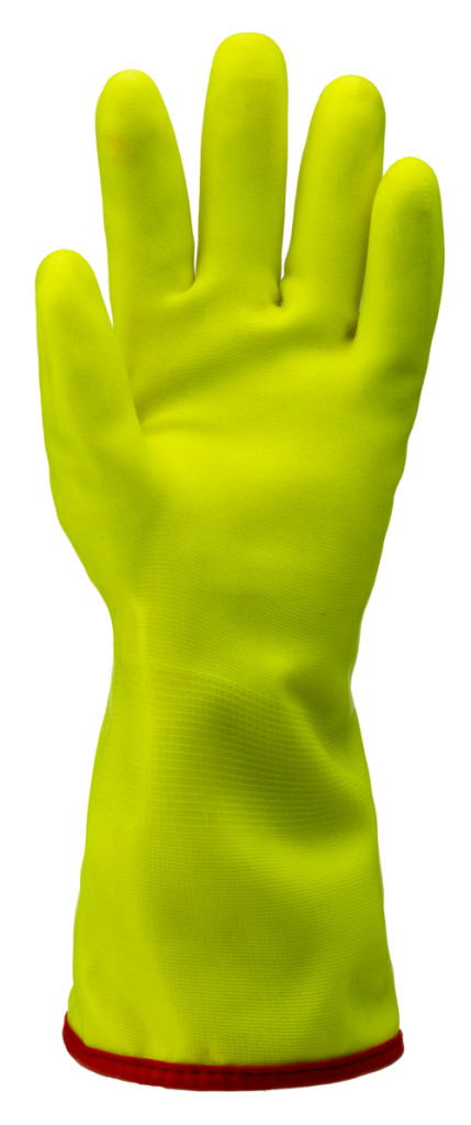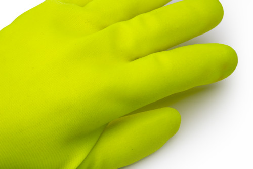 Nejlon varrás nélküli alapkesztyű Végig mártva sárga PVC-vel és a tenyerén csúszásbiztos szemcsés bevonat Hosszú egyenes mandzsetta: teljes hossz 35 cmFertőtlenített