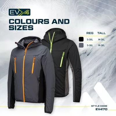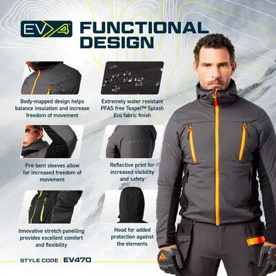 Az EV4 hőszigetelt hibrid dzseki ergonomikus, testre szabott kialakítással rendelkezik a hőszigetelés és a kényelem egyensúlyának megteremtése érdekében. A hőszigetelés segít melegen tartani a testet, míg az innovatív ActiReach™ hónaljpanel növeli a karok és a törzs mozgékonyságát, hogy korlátlan mozgást és rugalmasságot biztosítson. Két zippzáras oldalsó belépő és két zippzáras mellzseb rengeteg biztonságos tárolóhelyet kínál.