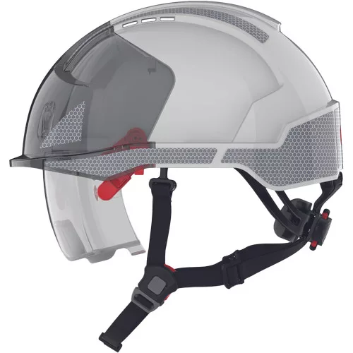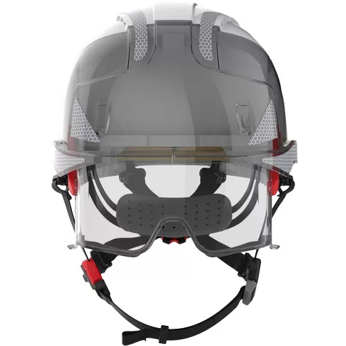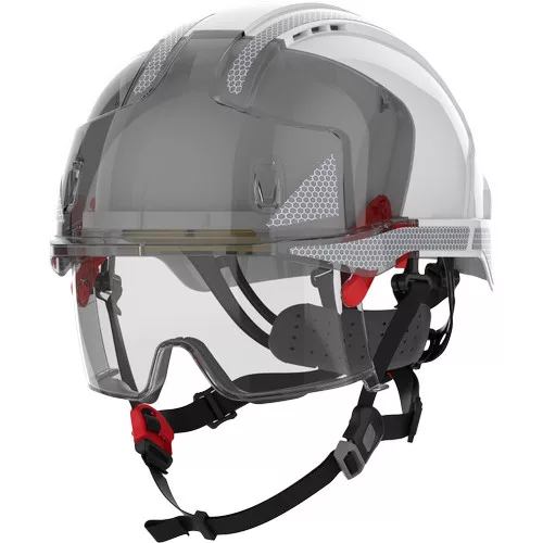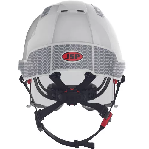 The JSP EVO® VISTAlens® DUALSWITCH™ industrial safety helmet combines the new technology of the EVO® VISTA® retractable safety glasses with the innovative DUALSWITCH™ chin strap system, fully certified to EN 397 and EN 12492. DUALSWITCH™ technology allows for easy change between both standards by simply switching the strap UP for EN 397 and EN 50365:2002 and switching the strap DOWN for EN 12492 and EN 50365:2002. The VISTAlens® visor offers Class B impact protection – tested with a 6mm steel ball bearing at speeds up to 430 km/h. The visor is replaceable, allowing users to replace it with a VISTAshield® face shield to have the right protection at hand when needed. Shield Features - Optical Class 1; T - impact resistance at extreme temperatures (tested at -5 °C and +55 °C); K - resistance to scratches and surface damage by fine particles; N Rated - resistance to fogging and misting; UV protection - 2: UV filter; tested for molten metal; tested for lateral deformation; reflective treatment with CR2 stickers increases the visibility of the helmet when illuminated at a distance of more than 300 meters