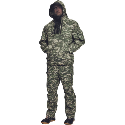 • atkák, szúnyogok, törpe, nyúlik és más típusú vért szoptató rovarok elleni védelemre tervezték. • Az öltöny védő elemei: atkák csapdái a redőzött kabátban és nadrágban, megakadályozzák, hogy az atka rohamozza fel a ruhát. • Az ujjak belső mandzsettaja és nadrág szorosan illeszkedik • anti-szúnyogháló-burkolat (szükség esetén a háló könnyen illeszkedik a mellkas zsebébe) • a lábhurok biztonságosan kúposak a nadrág lábszélességén