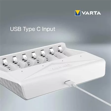 Varta Multi Charger töltő - 8 cella egyidejű töltése. -8 töltőnyílás (páros töltés) -kompatibilis akkumulátorméretek: 2x / 4x / 6x / 8x AA / AAA NiMH -töltőáram: AA: 450mA / AAA: 200mA -jobb töltési idő: 4,5 óra (4x1600mAh AA akkumulátor esetén) -USB C bemenet -tartalmazza az 50 cm-es USB C kábelt a töltő tápellátásához -zöld LED-ek a töltés jelzésére -új, fejlett biztonsági technológiával: Időzítő, mínusz Delta V lekapcsolás, rossz cella - alkáli detektálás, rossz polaritásvédelem, rövidzárlat elleni védelem -csepegtető töltés a legjobb töltési eredményekért -VARTA minőség=megbízhatóság