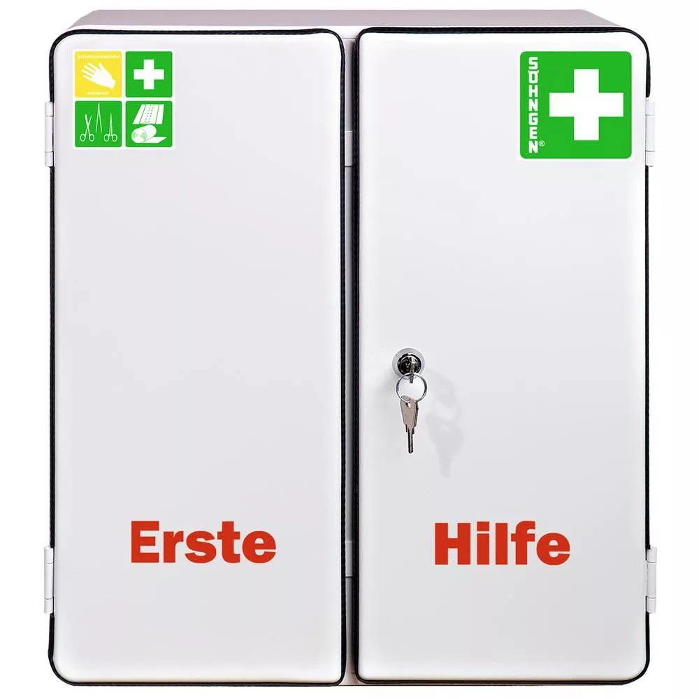 Elsősegély szekrény 2 polccal, fehér, din 13157 szabvány szerinti töltettel, széxméxma 404x170x462 mm
