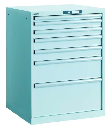 Esd fiókos szekrény, 7 fiókkal, 1x50 mm, 2x75 mm, 2x100 mm, 2x150 mm, tartó/fiók. 75 kg, szé x mé x ma 459x612x800 mm, cilinderzár, ral7035