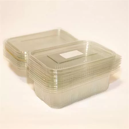 Ételtároló doboz, egybefedeles, újrahasznosított műanyag, szögletes, 750 ml, 100 db, "Party", víztiszta