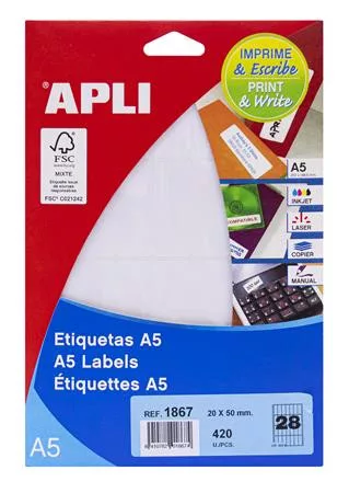 Etikett, 20x50 mm, kerekített sarkú, A5 hordozón, APLI, 420 etikett/csomag