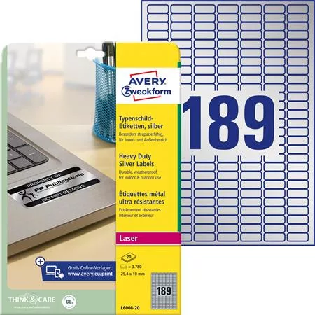 Etikett, 25,4x10 mm, poliészter, időjárásálló, AVERY ZWECKFORM, ezüst, 3780 etikett/csomag