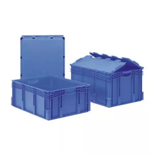 Euronorm újrafelhasználható tartók, fedéllel, standard talppal, teherbírás 60 kg, űrtartalom 49 l, hxszxm kívül/belül 800x600x138/762x562x115 mm, kék színű