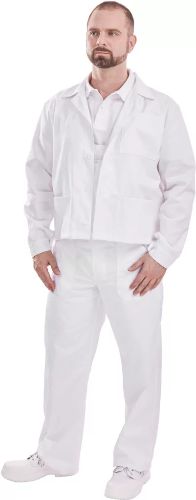 Fehér színű, 230 g/m2 vastag, kiválóan szellőző, testbarát 100% pamut alapanyag, mely 90°C-on is mosható, övbújtatós derék, két oldalsó- és egy farzsebbel