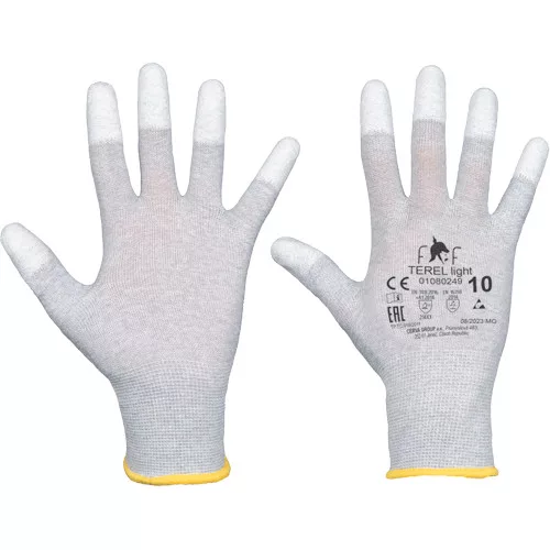• kötött, varratmentes, antisztatikus PES kesztyű integrált szénszállal • ujjhegyen PU mártás •rugalmas mandzsetta