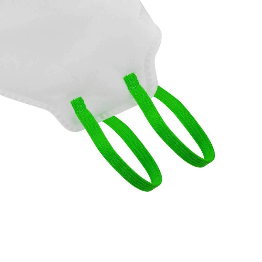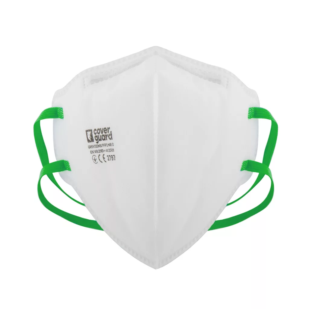 Egyszer használatos, függőlegesen összehajtható FFP1 pormaszk elektrosztatikus meltblown eljárással előállított alapanyagból, elasztikus szövet fejpánttal, állítható orrcsipesszel, mikrohabosított betéttel.