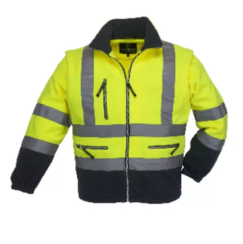 * 330 g/m2 vastag, bolyhosodásmentes thermo-polár, sárga/sötétkék színben* kettő az egyben: levehető ujjakkal polár mellénnyé alakítható* fluo jól láthatósági anyag, hosszanti és keresztirányú fényvisszaverő csíkokkal* gumizott ujjvégek, zsinórral állítható aljrész, álló gallér, egy felső- és két alsó cipzáros zseb
