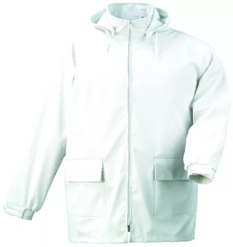 Külső réteg: 200 g/m2 vastag, poliuretánnal borított, 100% poliészter alapanyagból készült fehér kabát* Álló gallér* Egyutas cipzár a gallér tetejéig* Gumis mandzsetta tépőzáras állítási lehetőséggel* 2 oldalzseb* Patentos, levehető, zsinórral szűkíthető kapucni* Hegesztéssel vízhatlanított varrás, ellenáll élelmiszeripari vegyszereknek