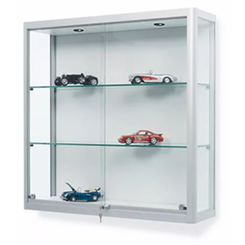 Fali vitrin tolóajtókkal, széxméxma 1000x300x1000 mm, 2 üvegpolc, alumínium ezüst, világítással együtt