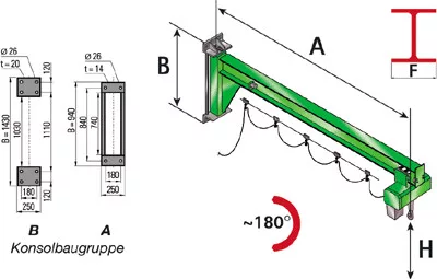 Falra szerelt forgódaru, elektromos láncos emelő nélkül, teherbírás 125 kg, a konzol szerelvény, fordulási tartomány 180 fok, kinyúlás 3000 mm,