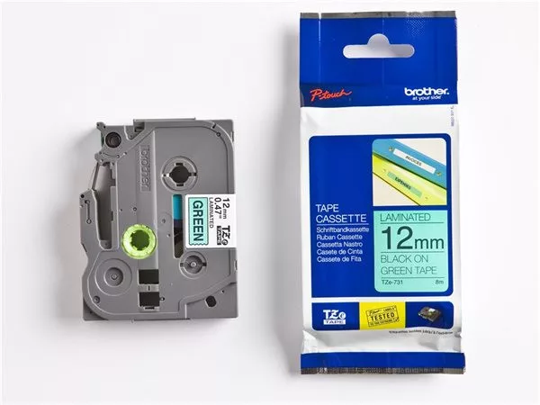 Feliratozógép szalag, 12 mm x 8 m, BROTHER, "TZe-731" zöld-fekete