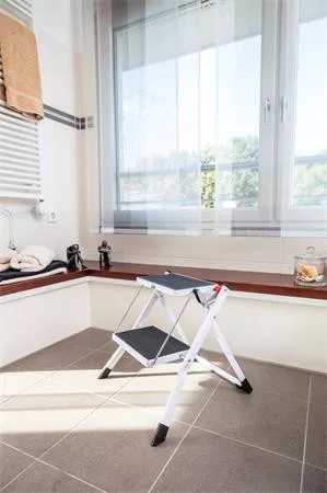 A könnyű és kompakt acél fellépő hordozófogantyúval és kioldógombbal. Két nagy lépcsőfok csúszásmentes betéttel biztosítja a biztonságos feljutást és a stabilitást.