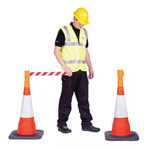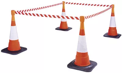 Figyelmeztető kúp rögzítés kültéri használatra, tensacone modell, narancssárga ház, szalaghossz 3,65 m, szalagszín piros/fehér átlósan
