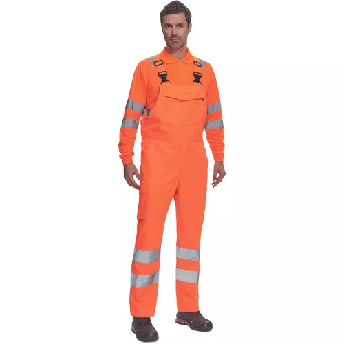 • férfi Hi-Vis mellesnadrág 7 cm széles fényvisszavető csíkokkal • rugalmas betét a hátsó részen • 2 oldalsó zseb + 1 érmezseb • 2 oldalzseb • 1 multifunkcionális mellzseb • rugalmas pántok műanyag csatokkal • meghosszabbítható szárhossz
