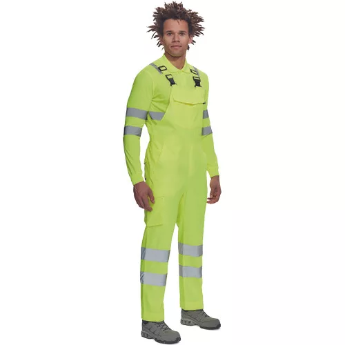 • férfi Hi-Vis mellesnadrág 7 cm széles fényvisszavető csíkokkal • rugalmas betét a hátsó részen • 2 oldalsó zseb + 1 érmezseb • 2 oldalzseb • 1 multifunkcionális mellzseb • rugalmas pántok műanyag csatokkal • meghosszabbítható szárhossz