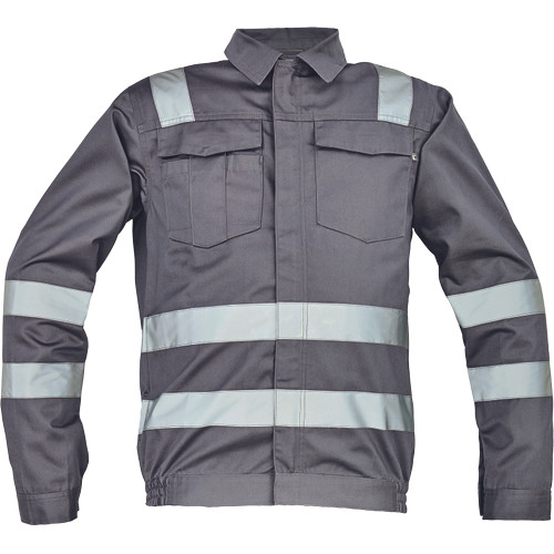 • férfi munkakabát 5 cm széles fényvisszavető csíkokkal • tépőzáras hajtókával fedett cipzár • 2 nagy zsebfedős mellzseb • rugalmas oldalsó betétek az alsó szegélyen • tépőzárral szűkíthető mandzsetták