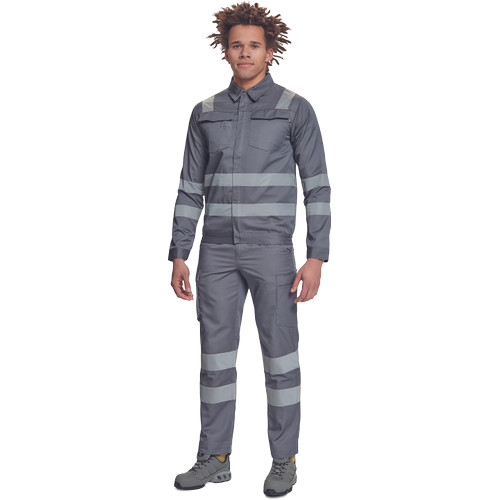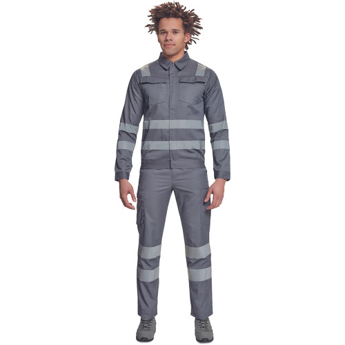 • férfi munkakabát 5 cm széles fényvisszavető csíkokkal • tépőzáras hajtókával fedett cipzár • 2 nagy zsebfedős mellzseb • rugalmas oldalsó betétek az alsó szegélyen • tépőzárral szűkíthető mandzsetták