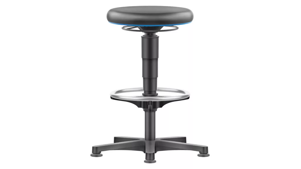 Gázrugós állíthatóságú munkaszék, fekete műbőr üléssel és csúszótalpakkal, lábtartóval, ülésátmérővel. 400 mm, ülésmagasság 560-830 mm