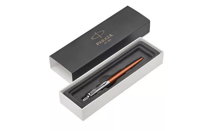 Golyóstoll, 0,7 mm, ezüst színű klip, Chelsea narancssárga tolltest, PARKER "Royal Jotter", kék
