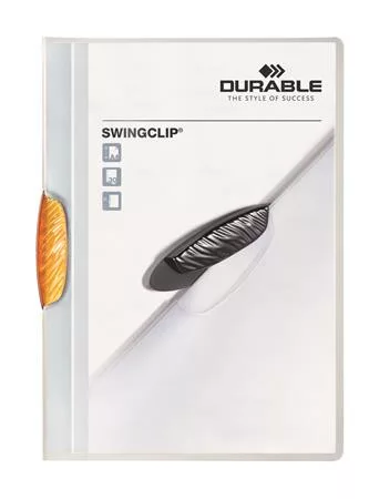 A SWINGCLIP egy vonzó, fiatalos klipmappa, minden típusú prezentációhoz, irathoz, rugalmas polipropilénből. -egyszerű és gyors dokumentumkezelés az oldalra kihajtható műanyag klipnek köszönhetően -színes vagy áttetsző kapoccsal -A4 formátumú dokumentumokhoz, pl. ajánlatokhoz, megbeszélési és oktatási dokumentumokhoz -lyukasztás nélküli dokumentumkezelés -lefűző szerkezet: elliptikus, kihajtható műanyag klip -lefűző szerkezet színe: narancs -előlap színe: áttetsző -hátlap színe: áttetsző -a dokumentum védett a naptól -külső méretek: 218 x 306 x 8 mm (szé x ma x ho) -kapacitás: 30 lap -formátum: A4 -irány: álló -anyaga: műanyag Itt megtekinthető és letölthető a termékadatlap. Itt megtekinthető és letölthető a környezetvédelmi adatlap. Gyártó/első EU forgalmazó elérhetősége:  DURABLE Hunke & Jochheim GmbH & Co. KG Westfalenstrasse 77-79, D- 58636 Iserlohn, Germany info@durable.de www.durable.de