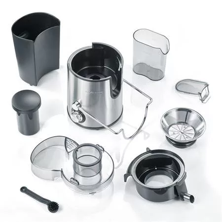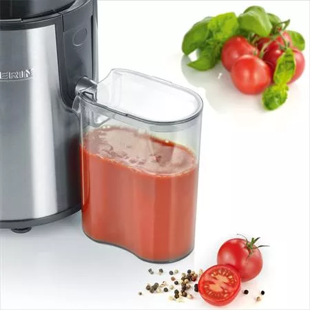 Kényelmes, 6 cm átmérőjű étel adagolóval rendelkező inox/fekete kivitelü gyümölcscentrifuga -2 sebességfokozat - kemény és puha gyümölcsökhöz -19.000 fordulatszám -1500 ml gyümölcshús tartály -500 ml gyümölcslé tartály -rozsdamentes acél gyümölcslé kiöntő, csepegés gátlóval -400 W teljesítmény