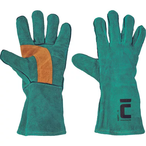 • 35 cm hosszú, hasított marhabőrből készült, pamut bélésű védőkesztyű erősített tenyérrésszel és fedett varratokkal • Tanúsítvány: hegesztés - A típus