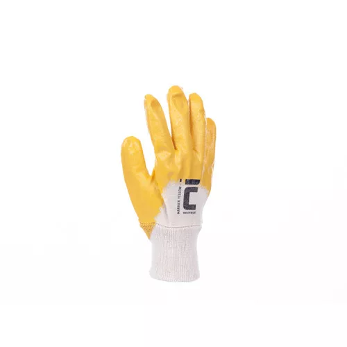• kötött pamutkelméből varrt kesztyű • félig nitrilbe mártva • rugalmas, kötött mandzsetta