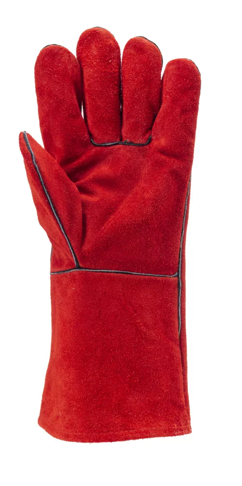Piros marhahasíték bőr kesztyű, gyapjú belsővel, hasítékbőr biztonsági mandzsettával és pamut béléssel.A mandzsetta 15cm hosszú