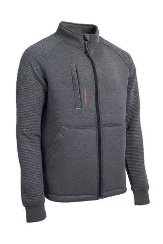 * Szürke thermo dzseki * 3D kétoldalas anyag: 78% poliészter / 16% viszkóz / 6% elasztán - 320 g/m2 vastag* álló gallér * állvédő * cipzáras záródás * hullámos díszítés az ujjakon * mandzsetta betétek * 1 cipzáras felső zseb * 2 paszpólos cipzáras oldalzseb