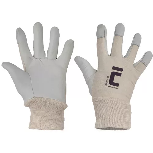 • kesztyű bárány színbőr tenyérrel • pamutszövet kézfejjel, megerősített ujjhegyekkel és kötött mandzsettával