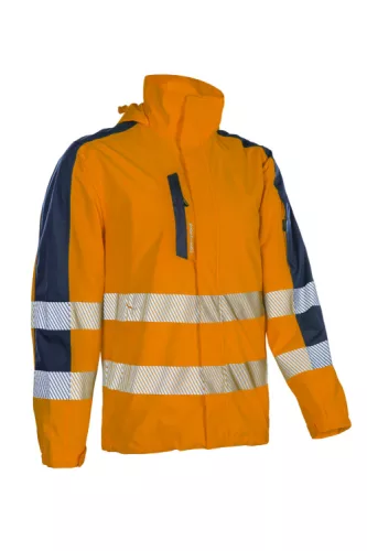 * 100 g/m2 vastag 2 rétegű Softshell alapanyag: 100% mechanikus stretch poliészter + TPU membrán, 100% poliészter hálós bélés a testen ás a karokon és 55 g/m2 vastag 100% poliészter tafeta bélés a kapucniban és a zsebeknél* 5 cm széles szegmentált fényvisszaverő csík: 2 a test körül, 2 a karon, álló gallér végéig futó, tépőzárral, fedett cipzár* az alapanyag vízállósága: 8000 mm, páraáteresztő képessége: 5000 g/m2/24h* hegesztett varrások, a gallérban rejtett, tépőzárral állítható vihar kapucni