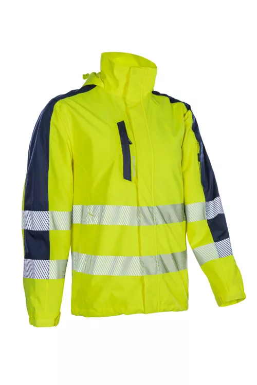* 100 g/m2 vastag 2 rétegű Softshell alapanyag: 100% mechanikus stretch poliészter + TPU membrán, 100% poliészter hálós bélés a testen ás a karokon és 55 g/m2 vastag 100% poliészter tafeta bélés a kapucniban és a zsebeknél* 5 cm széles szegmentált fényvisszaverő csík: 2 a test körül, 2 a karon, álló gallér végéig futó, tépőzárral, fedett cipzár* az alapanyag vízállósága: 8000 mm, páraáteresztő képessége: 5000 g/m2/24h* hegesztett varrások, a gallérban rejtett, tépőzárral állítható vihar kapucni* szitázható, karcsúsított szabású kabát * gumírozott és tépőzárral állítható mandzsetta és zsinórral állítható aljrész * kontraszt betétek a vállon és a karon, illetve a felső zsebnél * 1 függőleges cipzáras felső zseb2 cipzáros fedett oldal zseb 1 cipzáras belső zseb1 cipzáras zseb az ujjon