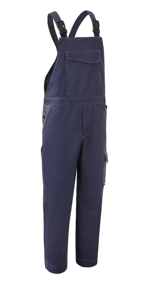 300 g/m2 vastag, 60% pamut + 40% poliészter kevertszálas alapanyag, regular szabású, vastag kopásálló melles nadrág kék színben,állítható műanyag csatos vállpánt,övbújtatók, sok zseb, kényelmi betét a láb között, gombbal záródó, oldalt gumírozott és oldalgombos derék,megerősített térdrész, a száron még 5 cm-es lehajtási lehetőséggel