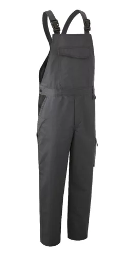 300 g/m2 vastag, 60% pamut + 40% poliészter kevertszálas alapanyag, regular szabású, vastag kopásálló melles nadrág sötétszürke színben,állítható műanyag csatos vállpánt,övbújtatók, sok zseb, kényelmi betét a láb között,gombbal záródó, oldalt gumírozott és oldalgombos derék,megerősített térdrész, a száron még 5 cm-es lehajtási lehetőséggel